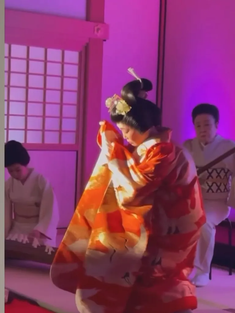 日本最古のお話であります古事記に記載がある「天の岩戸」を、箏・三絃・笙・篳篥・舞踊・英語の語りで表現しておりますこの舞台。ツーリストの皆様からは、絶賛されているのには、おそらく多くの理由があると思っております。
